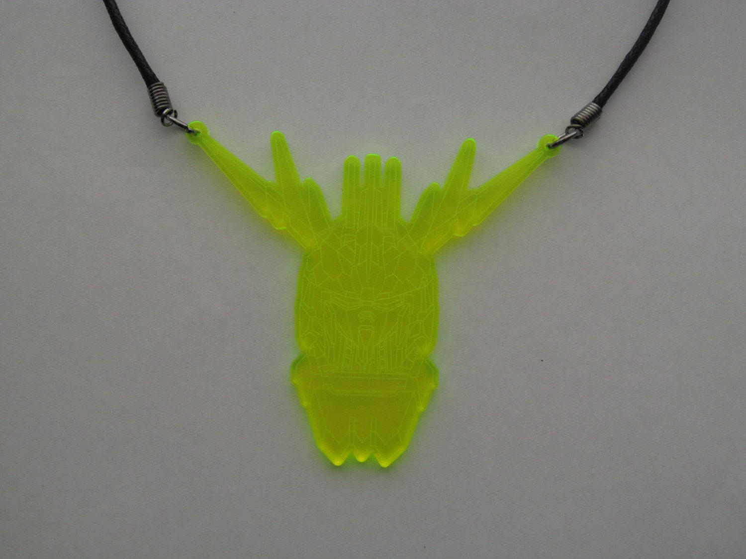 made of 3mm engraved neon acrylic, with waxed cotton cord and gunmetal findings measuring around 18" total length