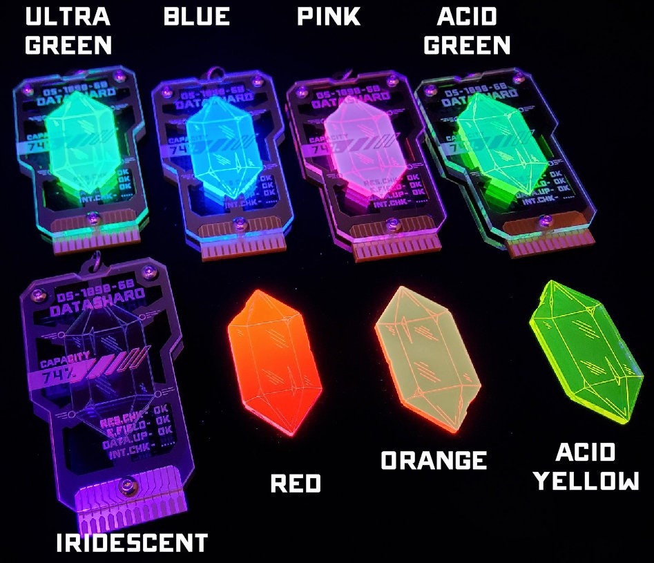 All colours except the iridescent glow vividly in UV light, the iridescent option changes colour like in the video.
