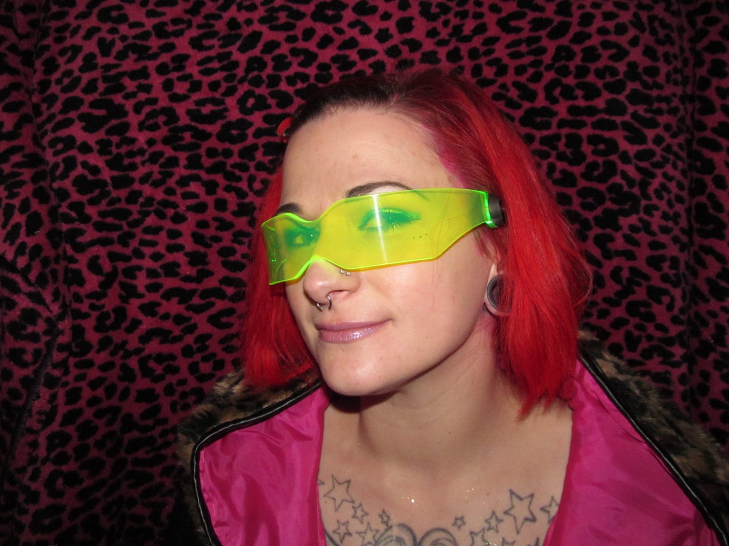 laser cut and hand formed neon green plexi with padded earpieces for comfort and ultra bright green leds, the photos don't really do them justice.